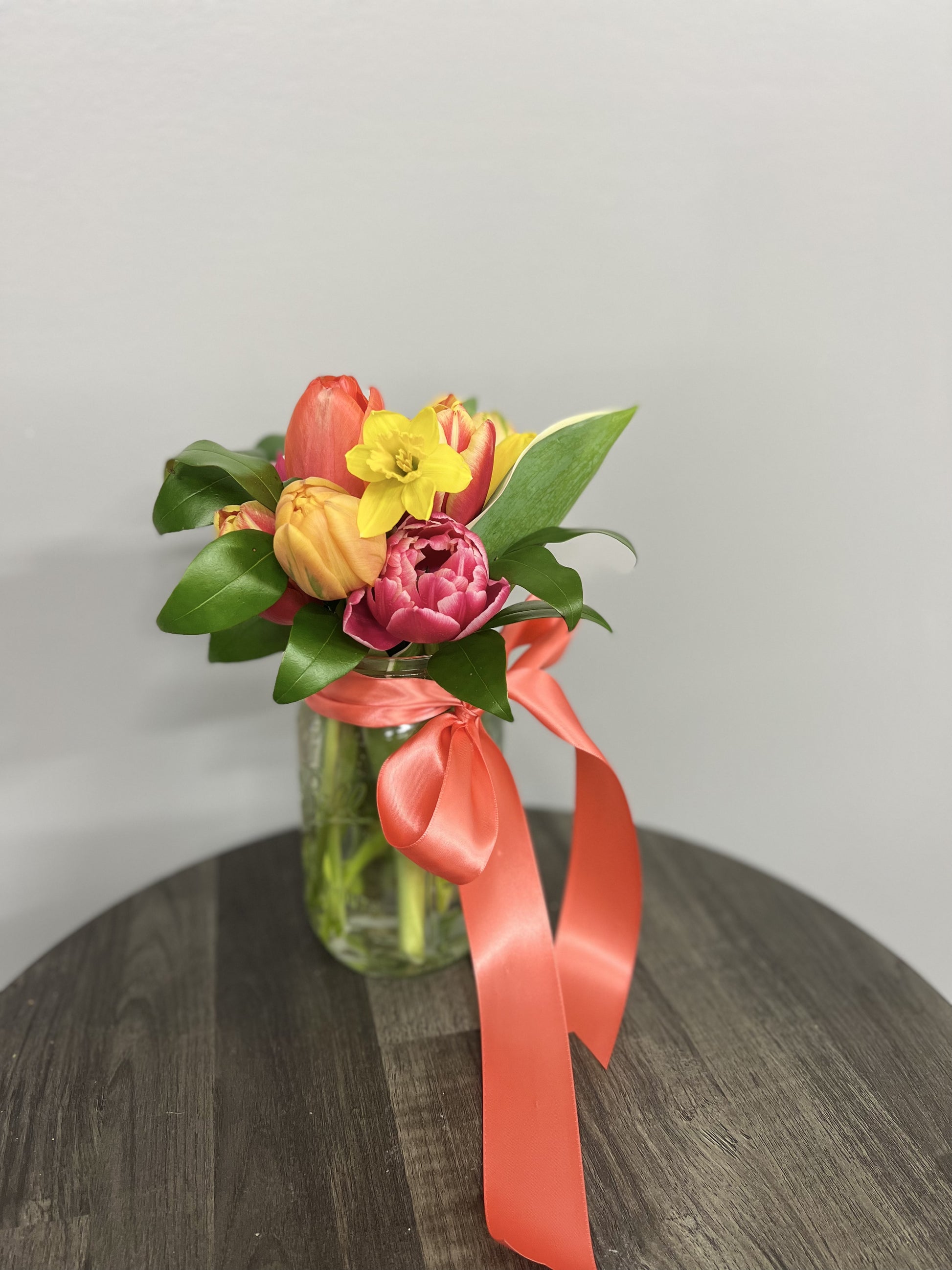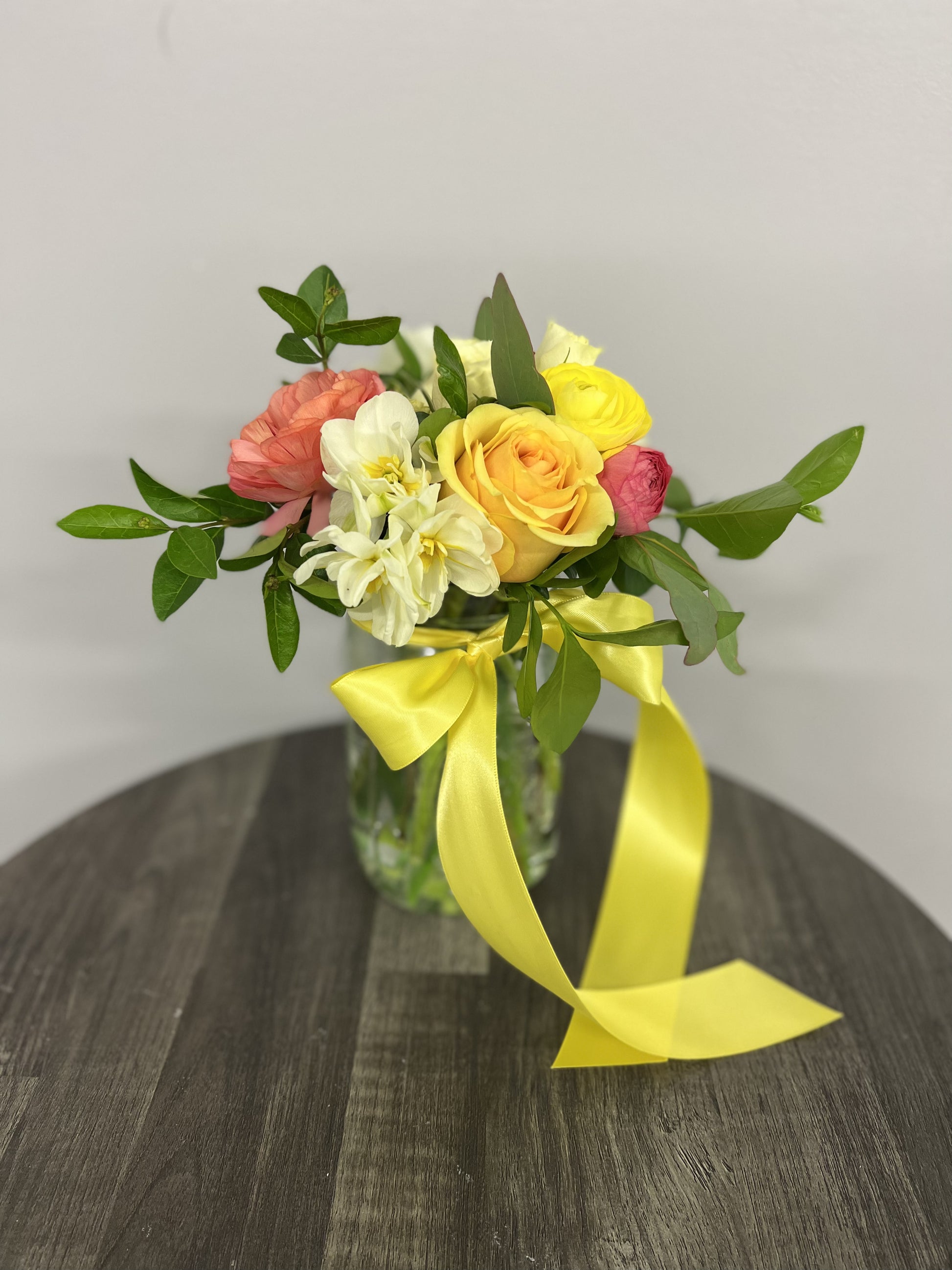 A handful of flowers and greenery in a mason jar and tied with a matching ribbon.